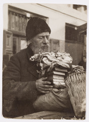 Zelechow. An old peddler carrying his stock of prayer books in the marketplace.