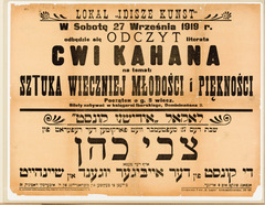 Grodno. Announcement of a lecture: "The Art of Eternal Youth and Beauty," by Cwi Kahan, 9/27/1919.