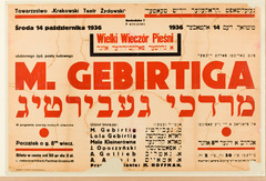 Krakow. An evening of folksongs, featuring Mordechai Gebirtig, the great Yiddish folk poet, in the Krakow Jewish Theater, October 14th, 1936.