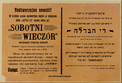 Augustow. Announcement of the approaching screening of the film: "Di Havdolo," about the tragic tribulations of the Jews under Czarist domination. 1928.