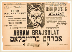Warsaw. Abram Brajsblat in concert. An evening of literary recitals, and Yiddish worker and Palestinian folksongs. June 16th.