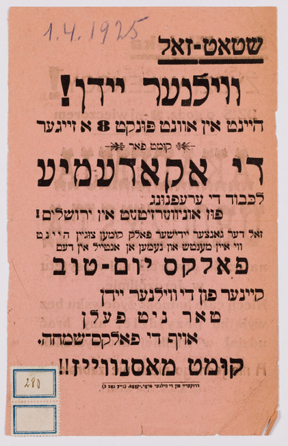 Polish Jews maintained ties with other Diaspora Jews and kept up with world events and life in other Jewish communities via Yiddish, Hebrew, and Polish newspapers; public lectures by visiting notables; and correspondence with family and friends overseas. Of particular interest were events in Palestine, both causes of celebration, such as the founding of Hebrew University in Jerusalem in 1925, and tragedies, such as the 1929 riots known as the "Hebron massacre," in which 67 Jews were killed.